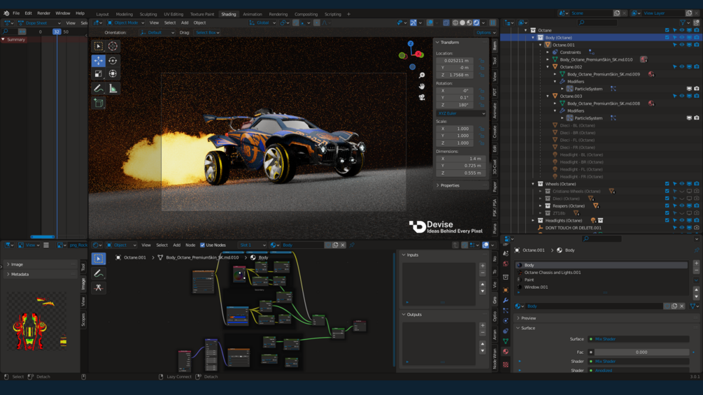 Each with image textured emissive lights and Anodized, Glossy, Matte and Metallic paint options. Each Car also allows you to test and use paintable custom and in-game decals just as you would with BakkesMod. Each car also has fully textured Diecis, Cristianos, and Reapers wheel meshes and both Cristianos and Diecis are able to be covered in mud with shader nodes. Finally, each car also inlcudes Alpha Boost as a particle emmission(only scene that has this).
